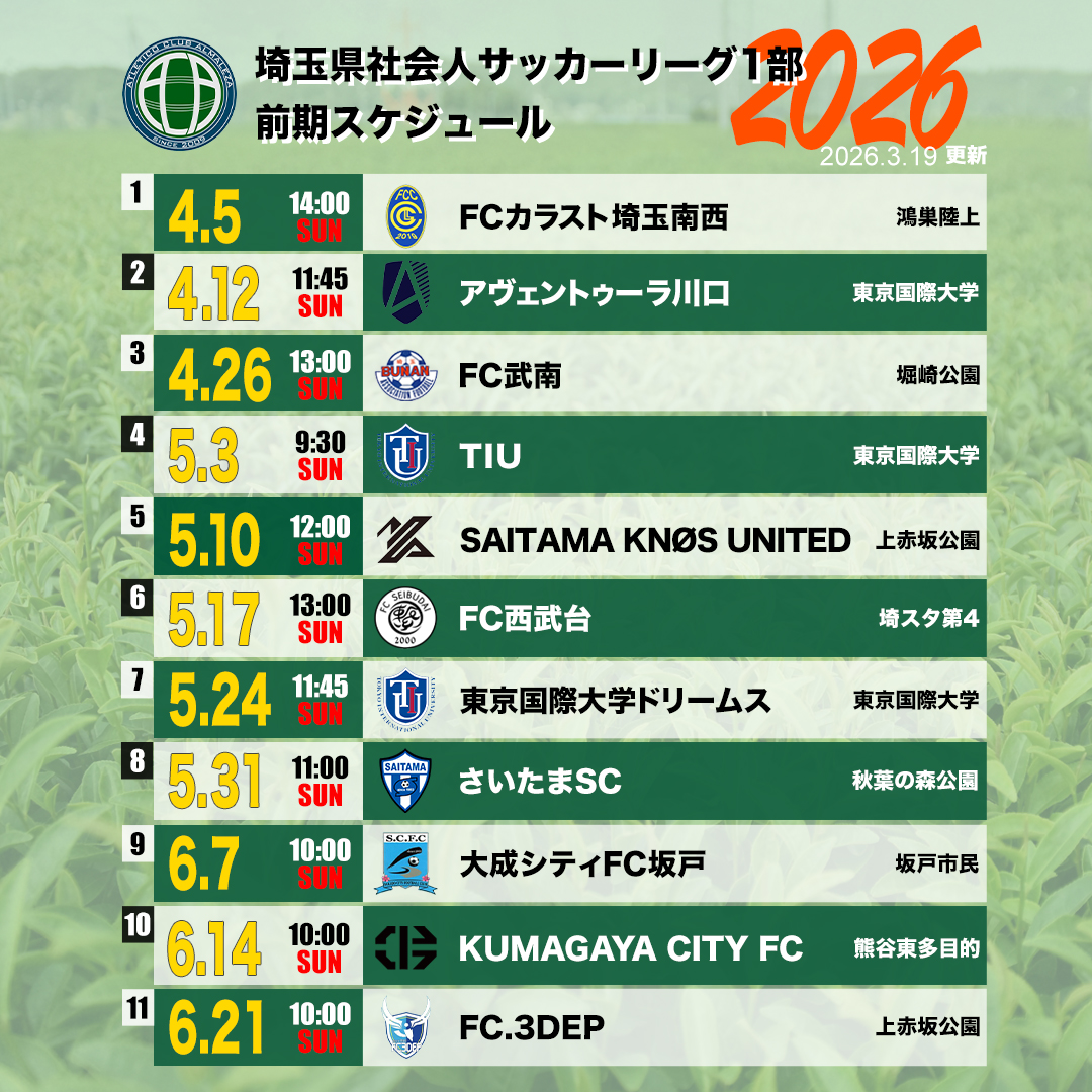 2026年埼玉県社会人サッカーリーグ1部前期の日程が決定しました。 前期リーグは12チームが1回戦総当たりを行い、その結果に基づき、後期は上位6チーム、下位6チームに分かれて総当たりを行います。 前期リーグの全日程は埼玉…