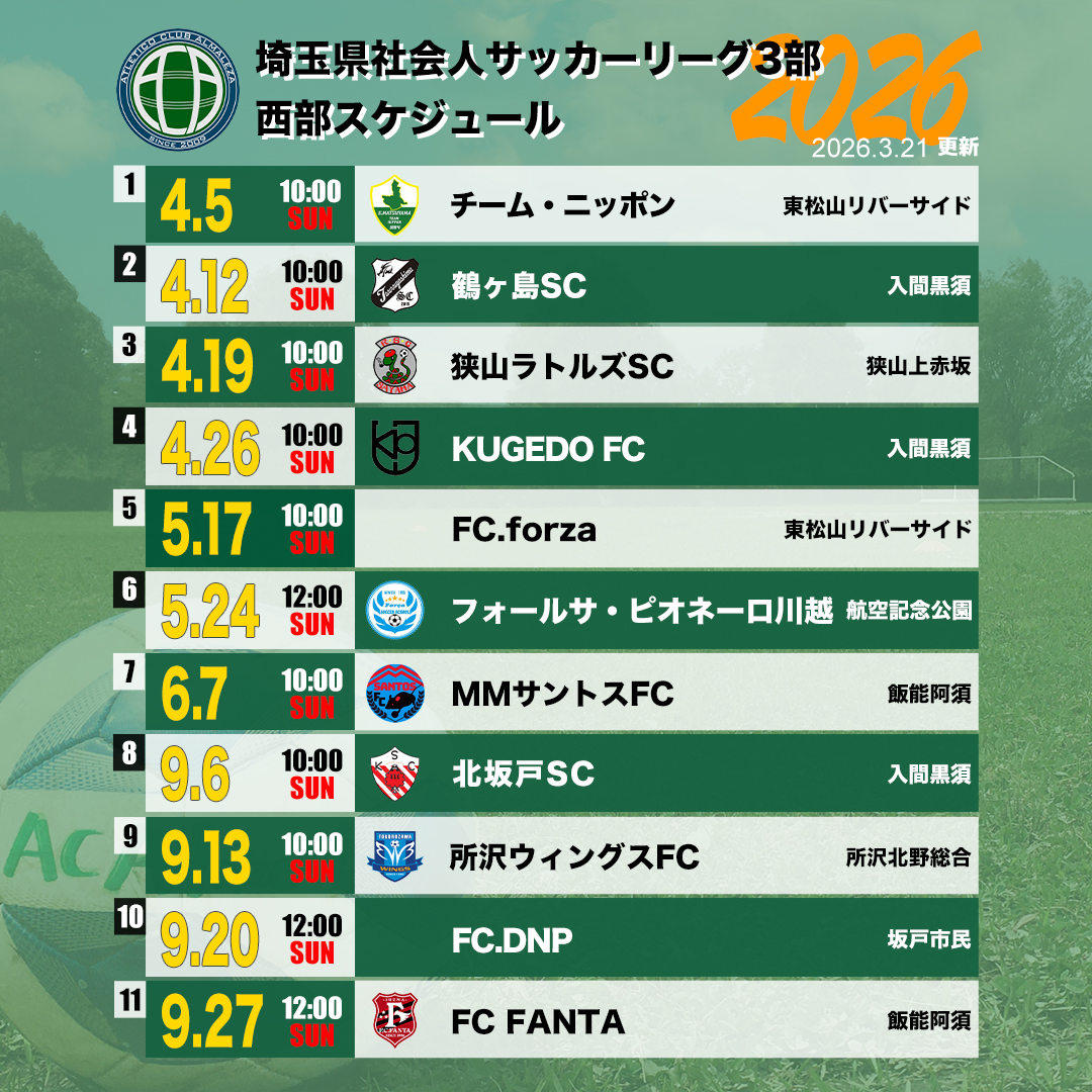 2026年度埼玉県社会人サッカーリーグ3部西部地区の日程が決定しました。全12チームが1回戦総当たりを行います。 リーグの全日程は埼玉県社会人サッカー連盟のサイトでご確認いただけます。https://ssfa.site/…