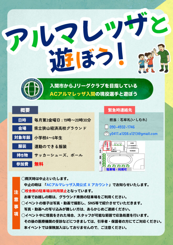 12月19日(金)『アルマレッザと遊ぼう』を、狭山経済高校グラウンドにて開催いたします。